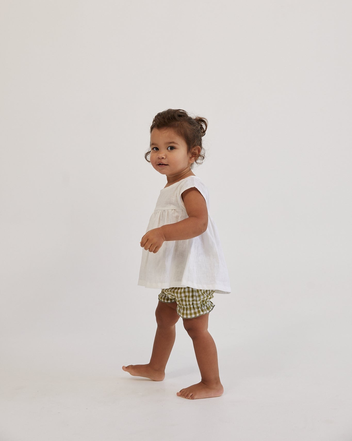 The perfect pair for playful days. The Indigo Blouse features fluttery sleeves and floral buttons in crisp white linen, while the Lark Bloomer brings charm with soft ruffles and a comfy elastic waist in olive gingham. Easy to wear as a set or mix and match with her other favourites.